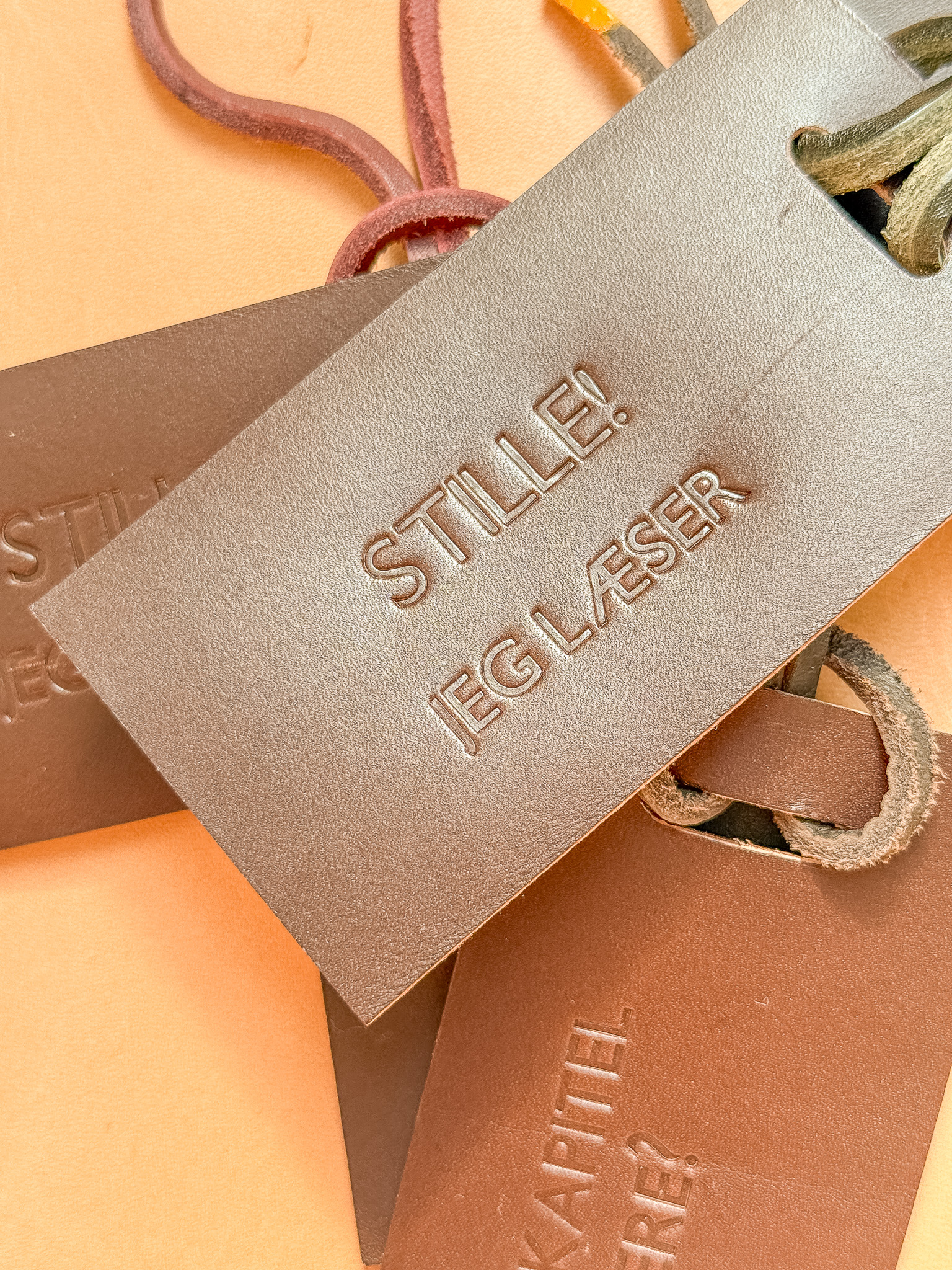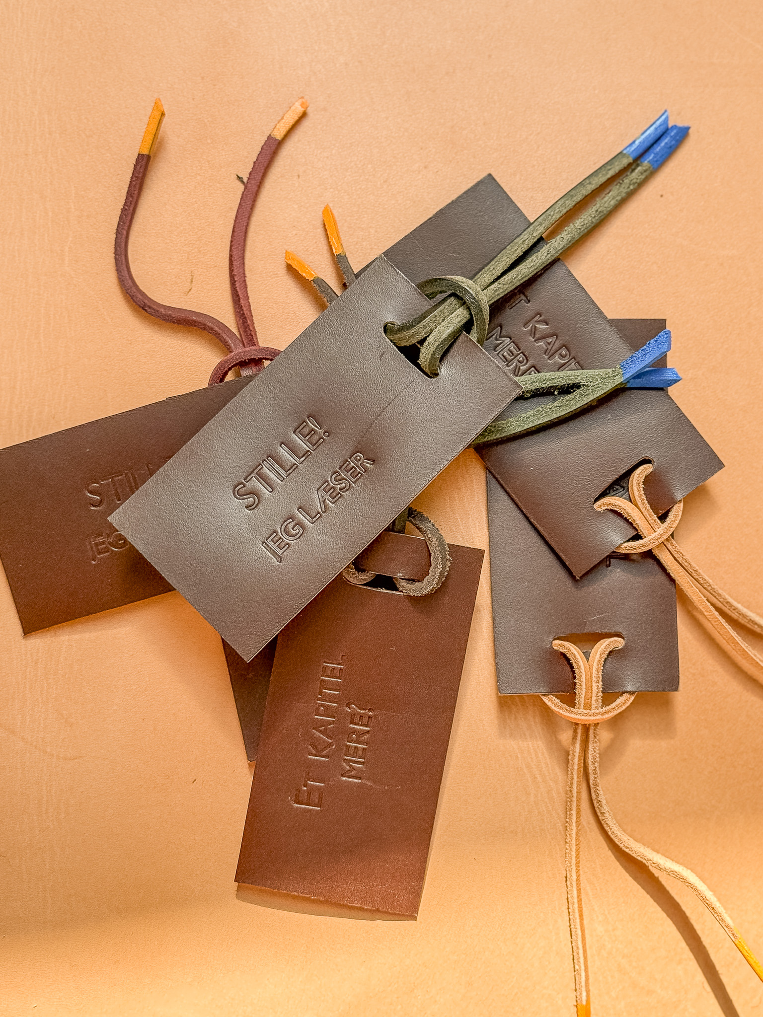 Disse bogmærker er fremstillet i vegetabilsk garvet kernelæder og fås i to varianter: Stille! jeg læser og Et kapitel mere?